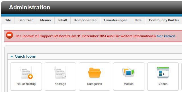Ende 2014 ist die letzte Version von Joomla 2.5 erschienen. Der Support wurde offiziell bereits am 31. Dezember 2014 eingestellt.