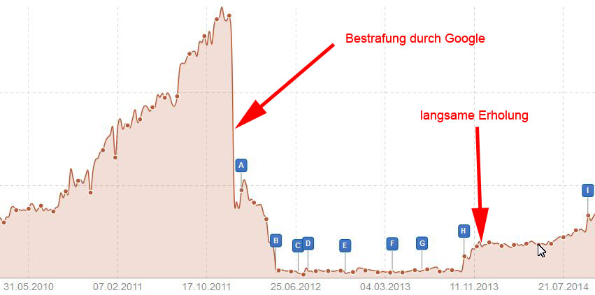Die einzelnen Buchstaben markieren die größeren Anpassungen (Google-Updates) der Suchmaschine Google.