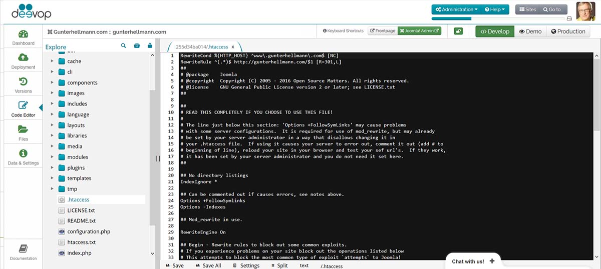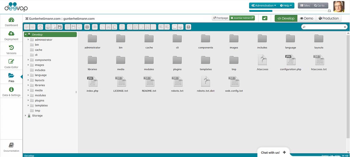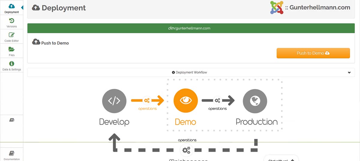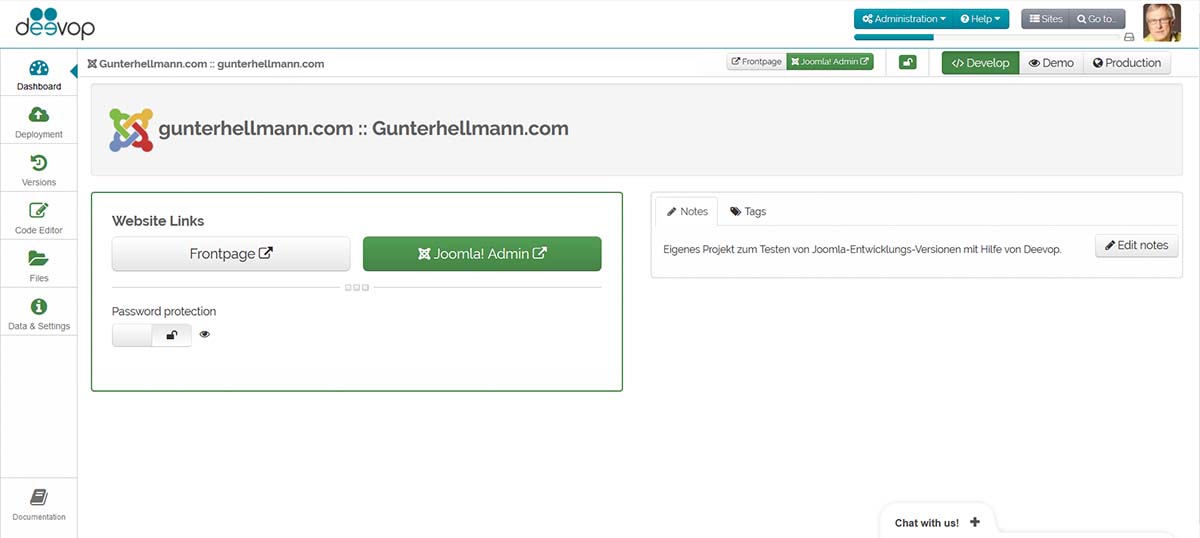 Bei meinem Deevop-Account lege ich ebenso aus einer Datensicherung von AkeebaBackup oder einem neuem Joomla-Paket eine neue Entwickler-Seite (Develop) an. An dieser kann ich so lange arbeiten, bis ich dem Kunden die Seite vorstellen möchte. Per Knopfdruck wird die Seite Gesichert und in den Demo-Bereich kopiert. Der Frontend-Link und das Passwort werden automatisch angelegt. Die schicke ich zum Kunden. Inzwischen kann ich weiter an der Entwicklerseite bauen.